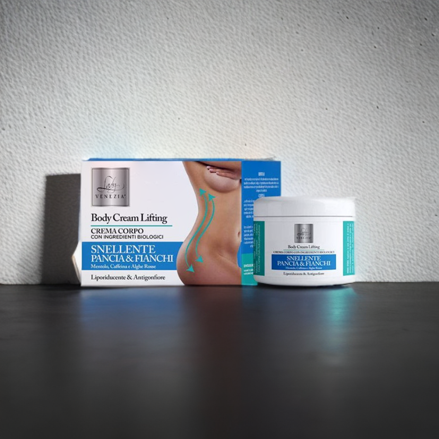 Lady Venezia Crema Adelgazante Vientre y Caderas es un tratamiento corporal con efecto frío-calor, liporeductor y antiinflamatorio, a base de Mentol, Cafeína y Algas Rojas.